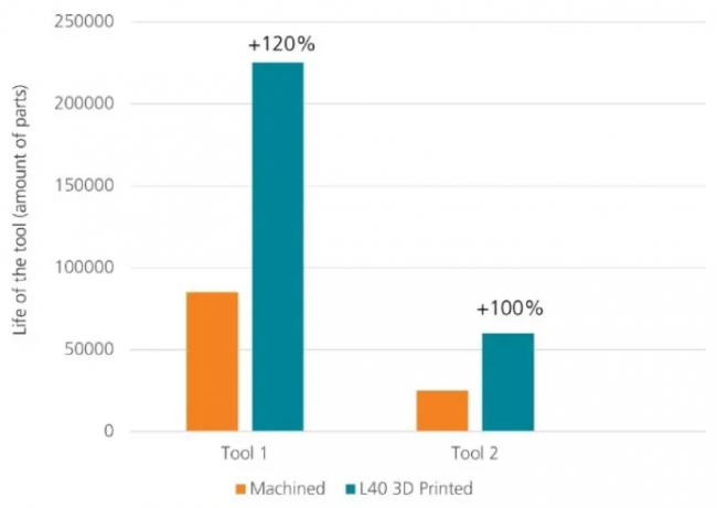 传统模具与增材制造模具使用寿命对比显示:经优化的随形冷却通道能针对性调控关键区域温度,显著降低热负荷,从而延长模具寿命。在早期项目中,增材制造模具的使用寿命已实现接近四倍的提升。